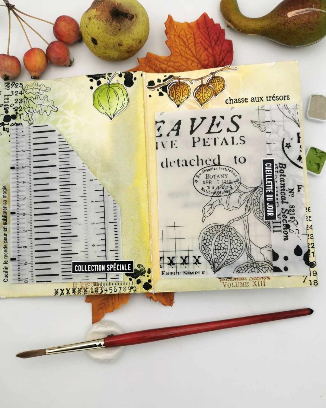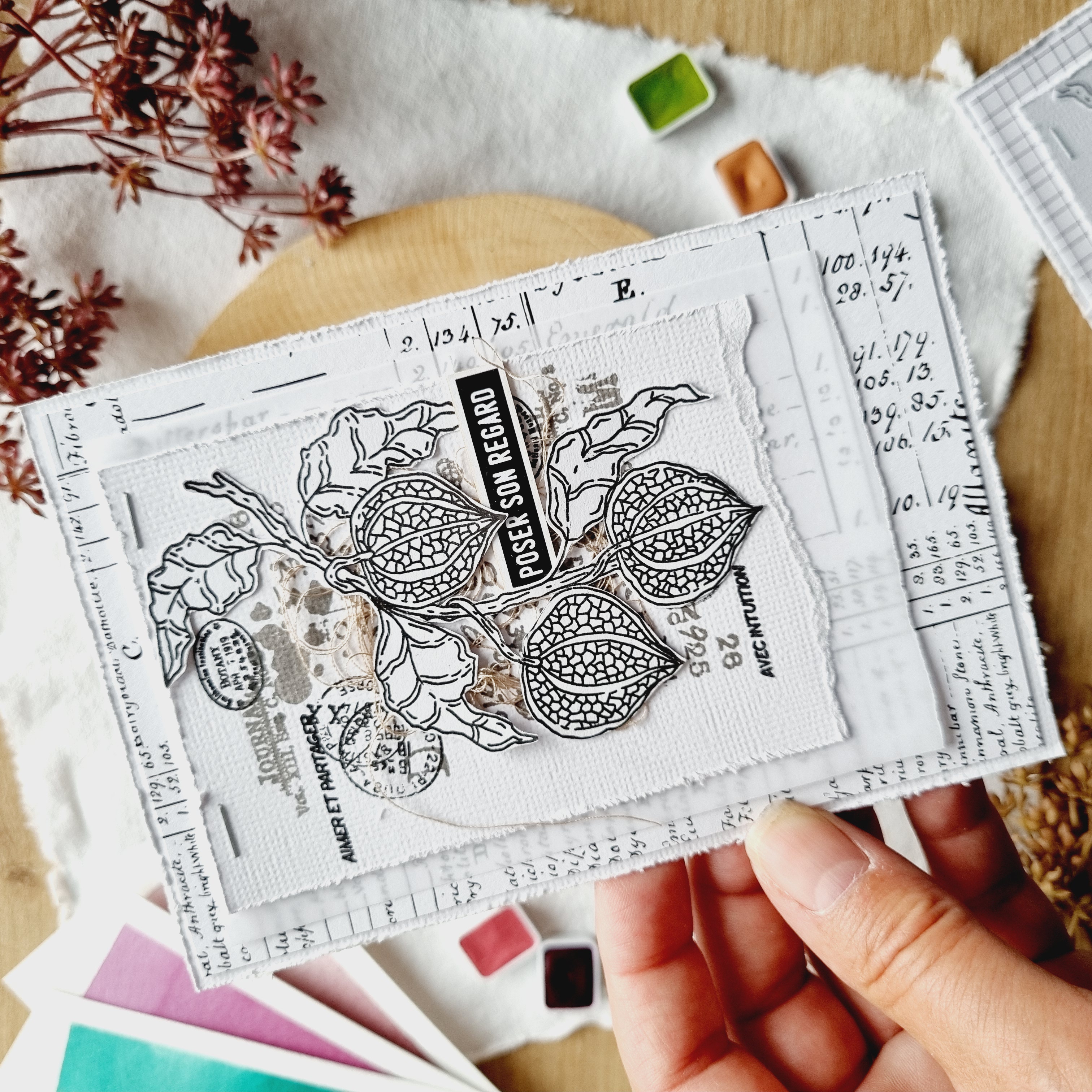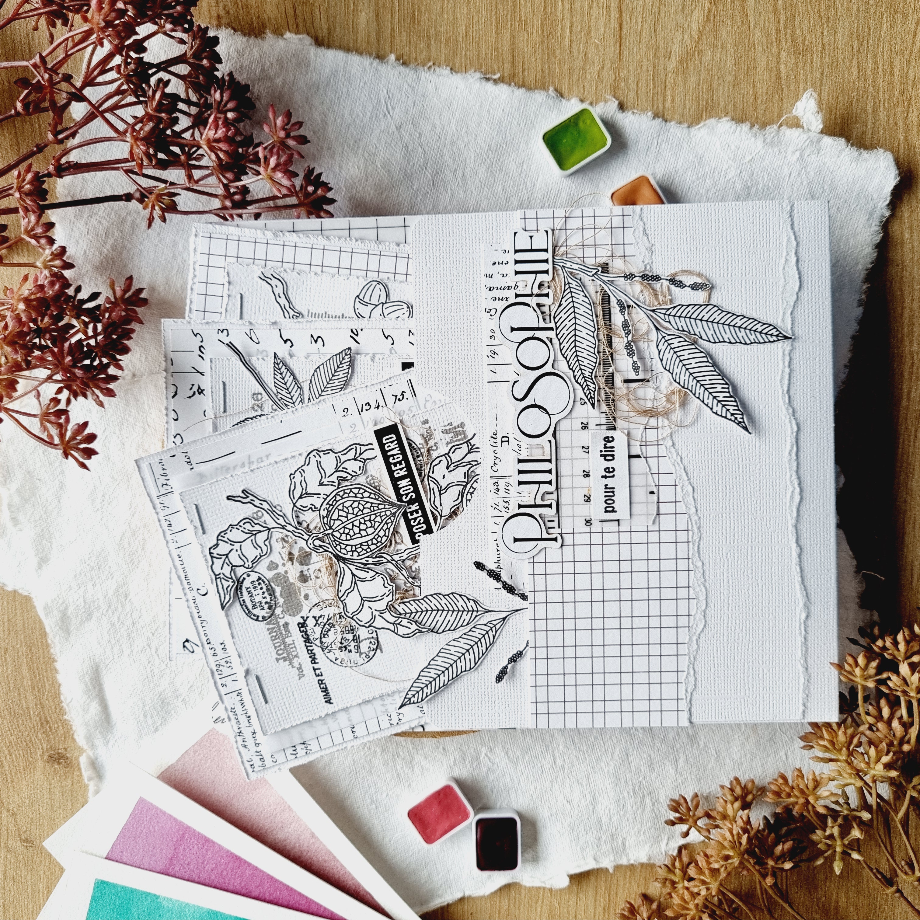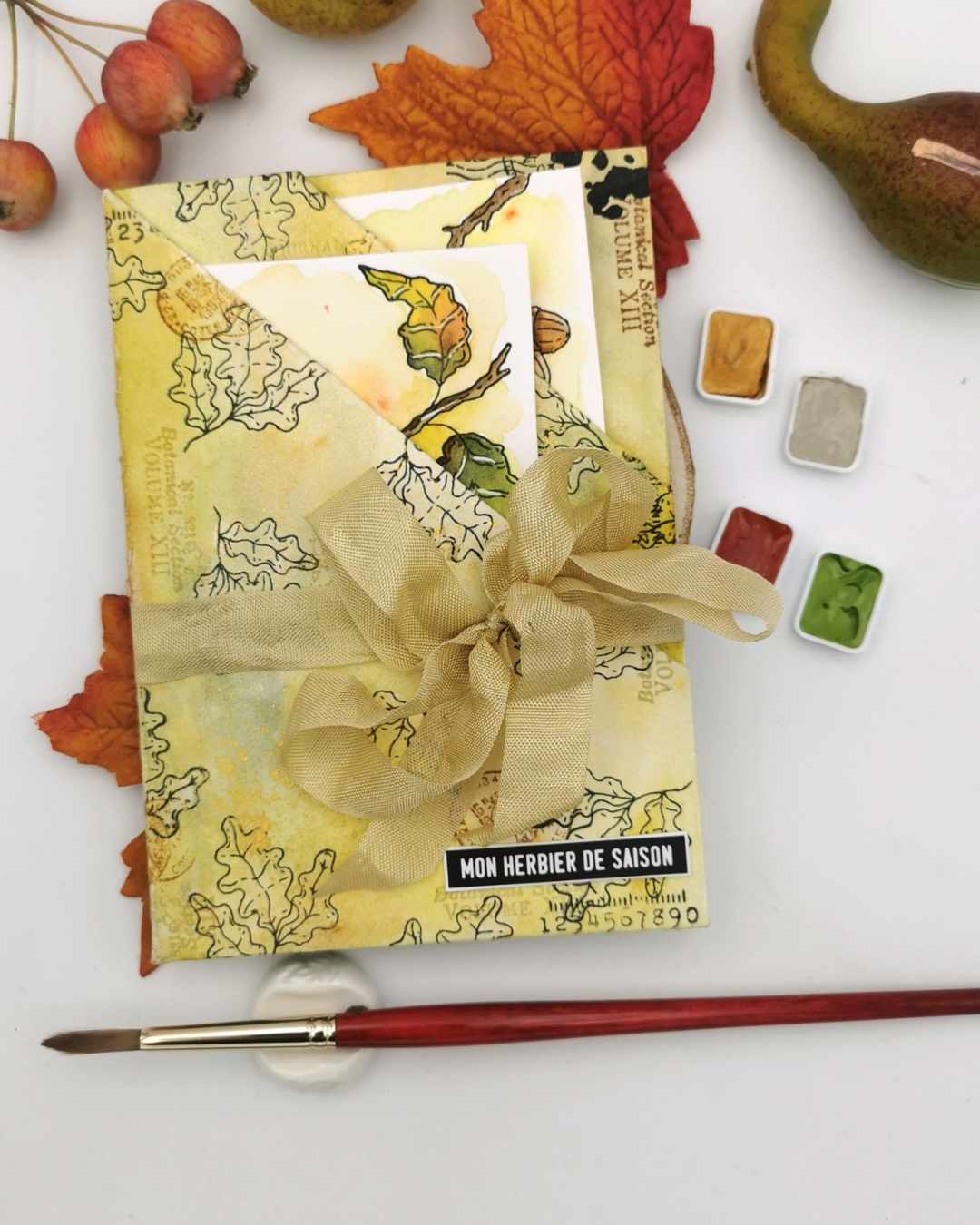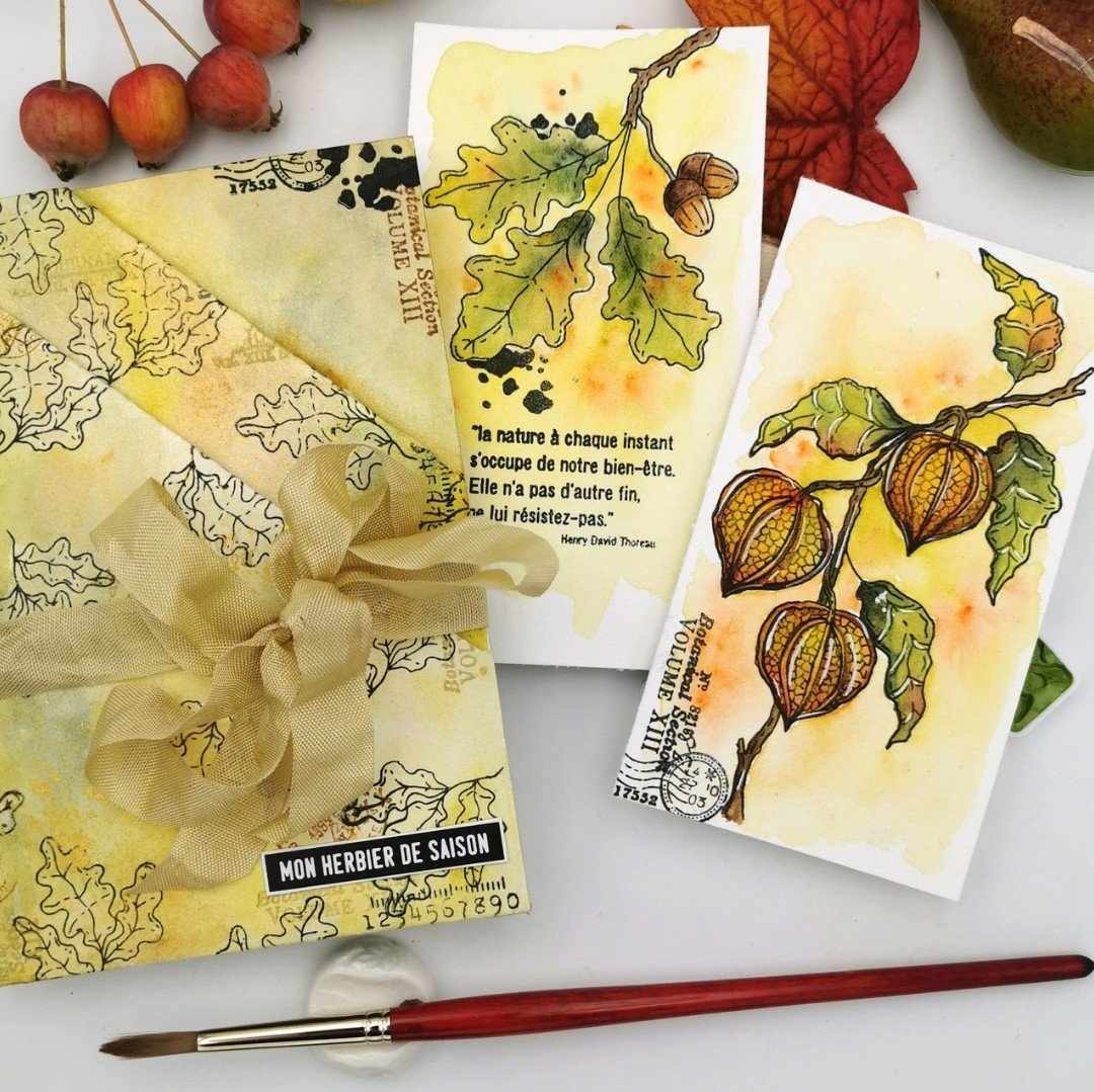 Cette pochette est créée à partir d'un papier aquarelle grain fin uni puis travaillée avec des aquarelles Isaro et Sennelier avec des touches de papier calque du set de papeterie et les petits mots (set dies cuts Mots d'automne)
