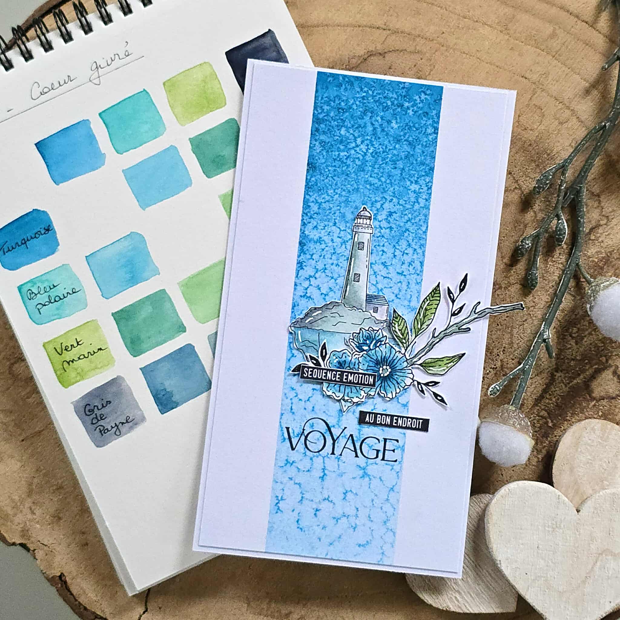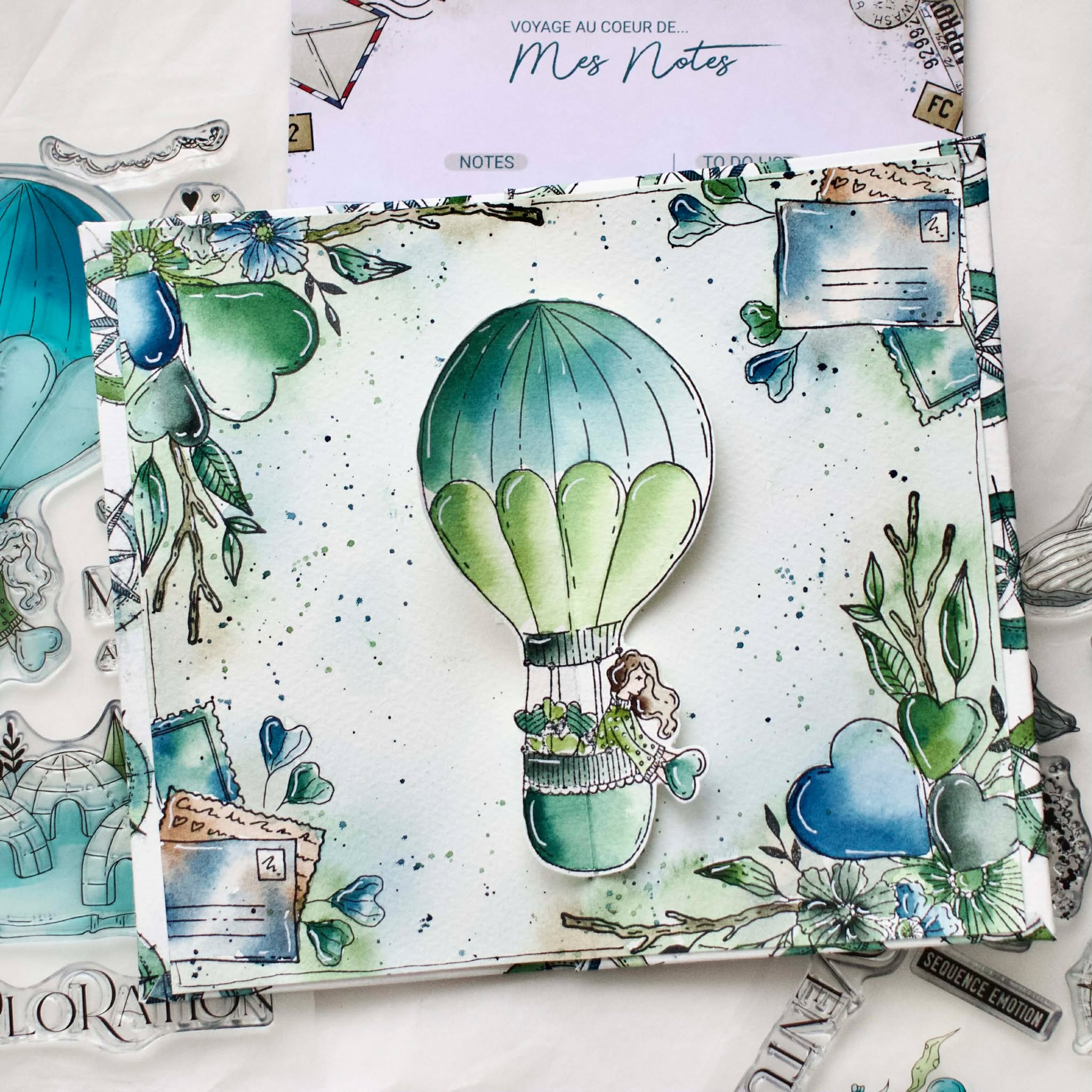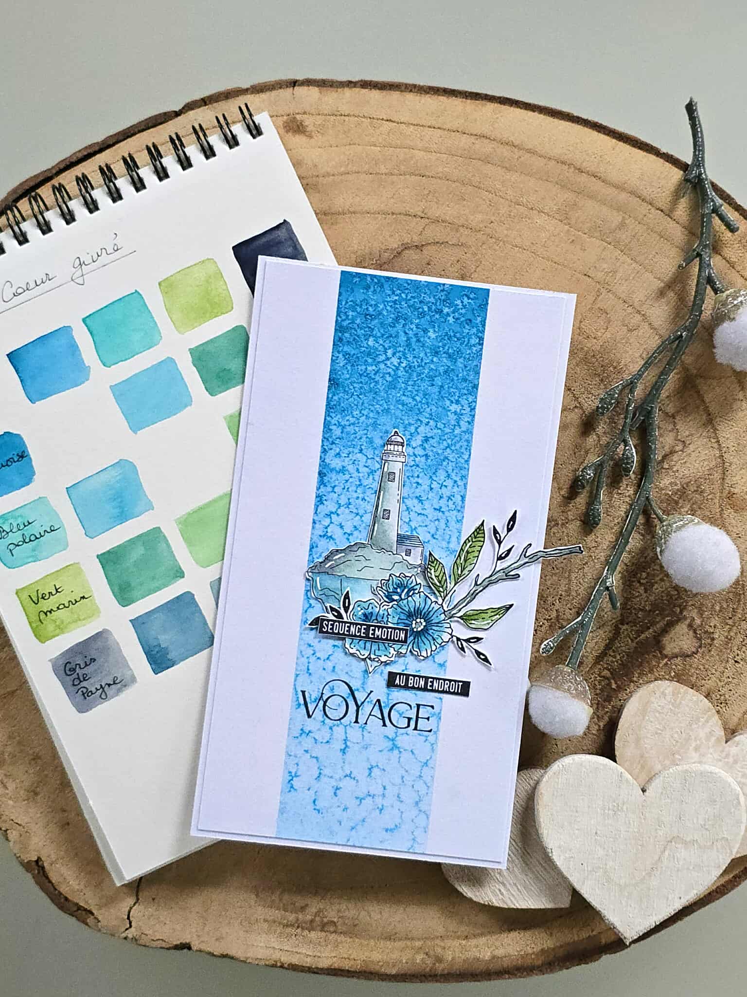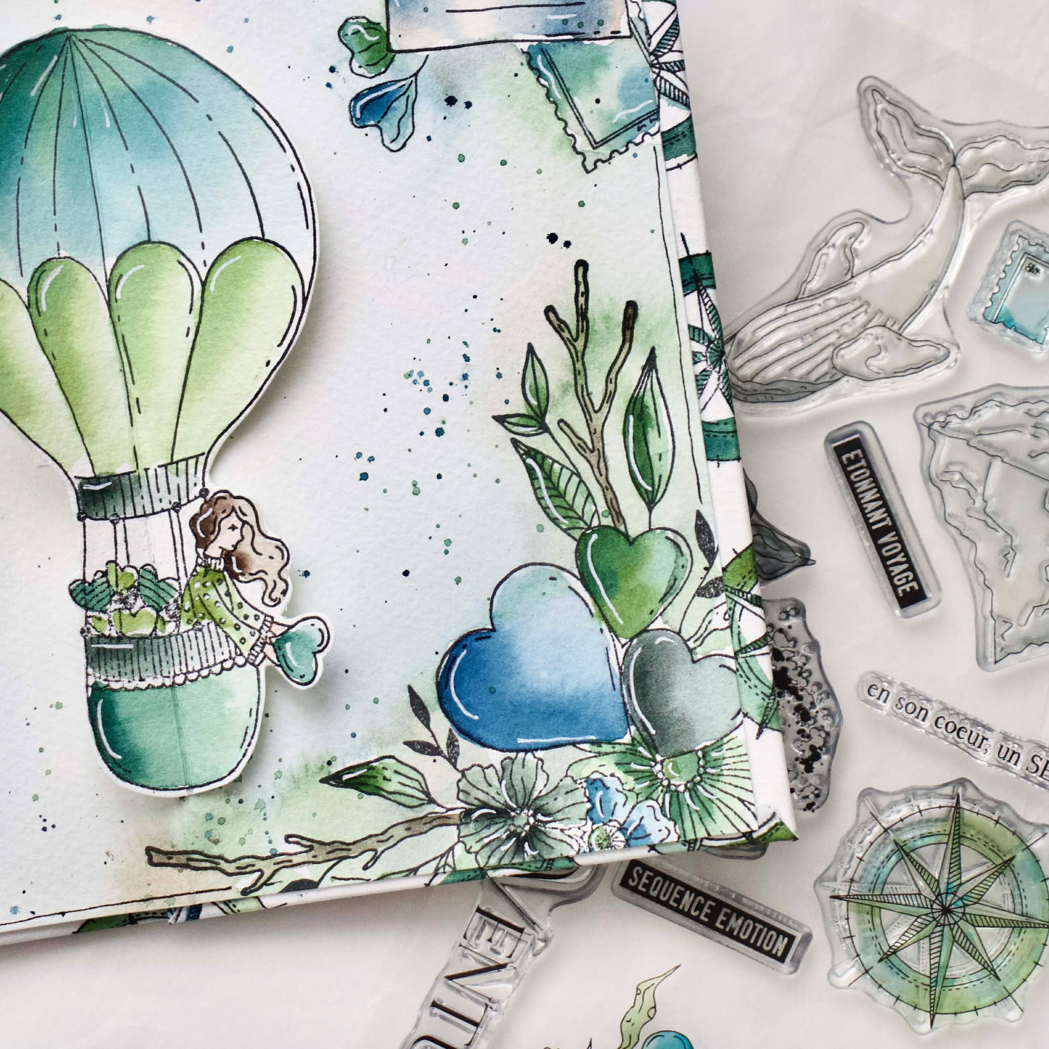 Avec Amb_Créa, Ludovic et la réalisation d'une carte façon carnet de bord avec des couvertures rigides et un travail de tampons et aquarelle avec "la boussole" sur la planche clear "Etonnant voyage"