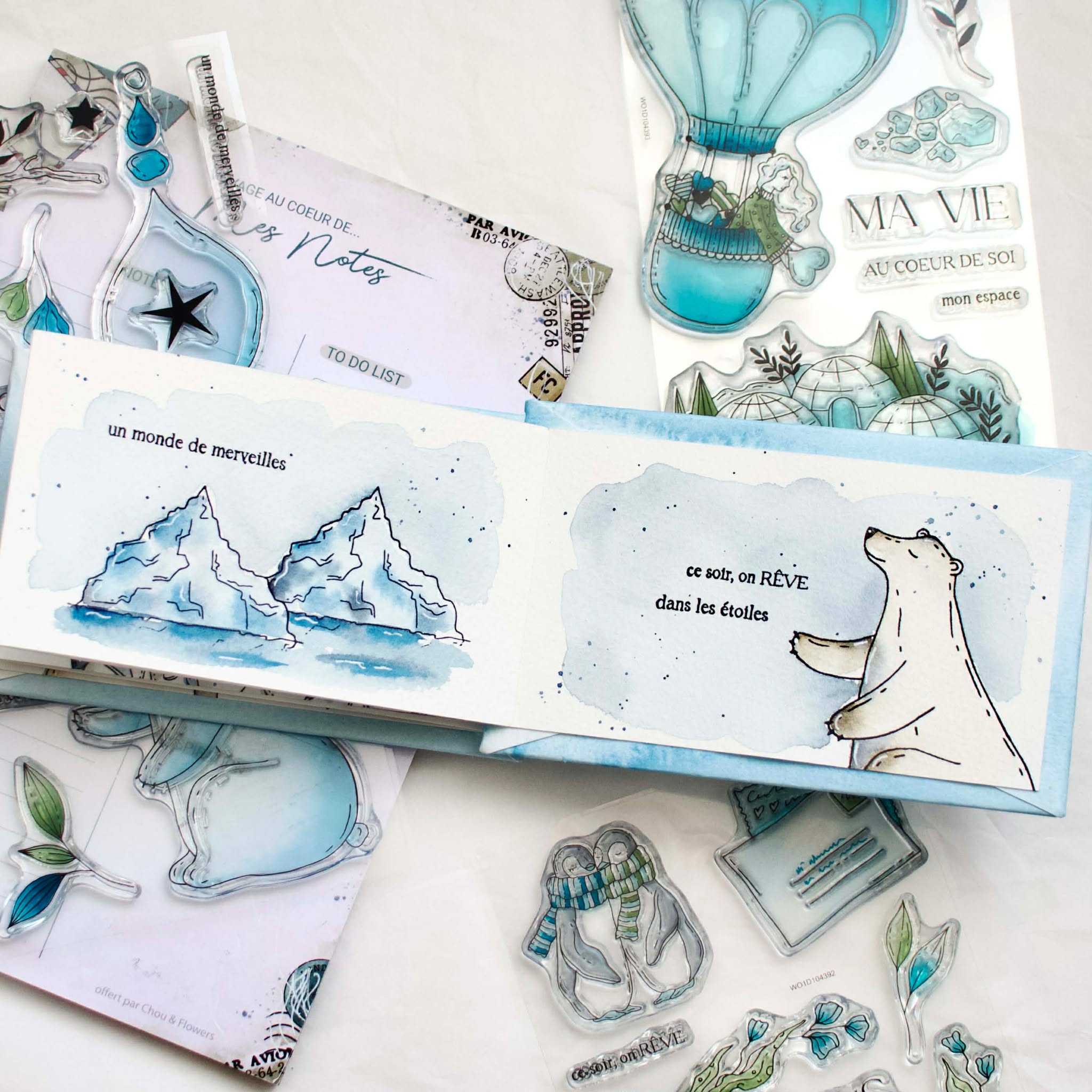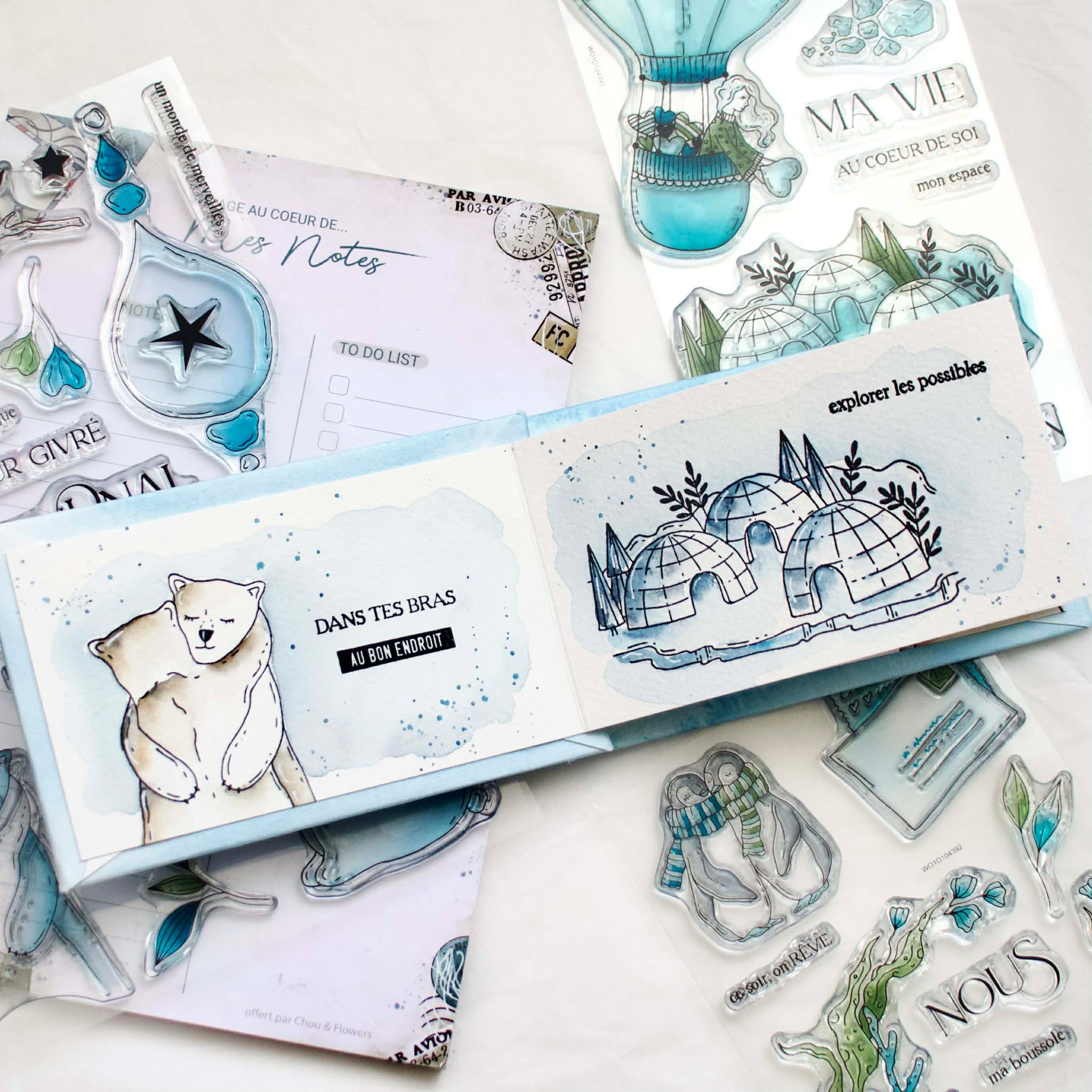 Mise en couleurs et réalisation des paysages polaires avec les aquarelles ISARO de notre set exclusif "coeur givré" + aquarelle Schmincke (brun transparent et indigo)