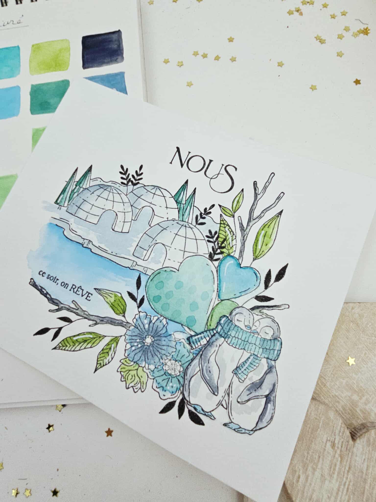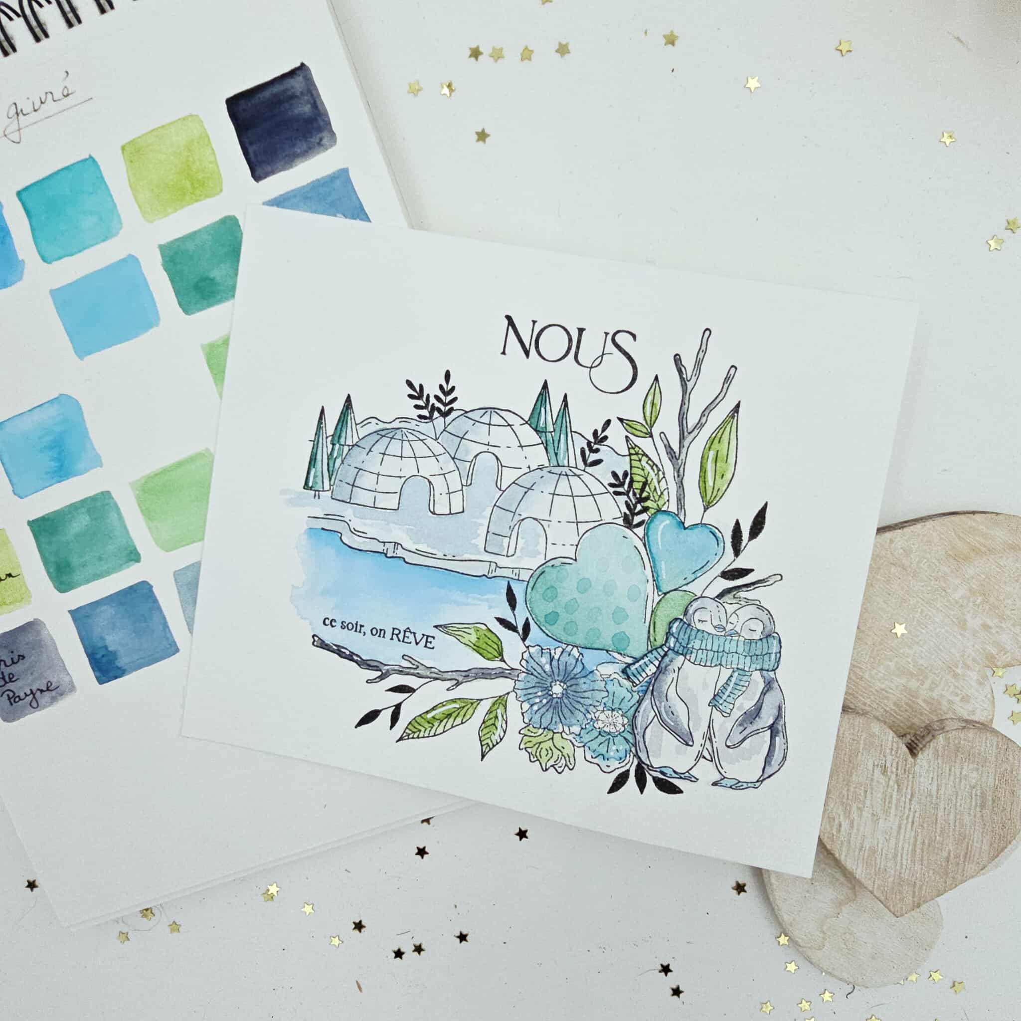 Mise en couleurs avec les aquarelles ISARO de notre set exclusif "coeur givré"